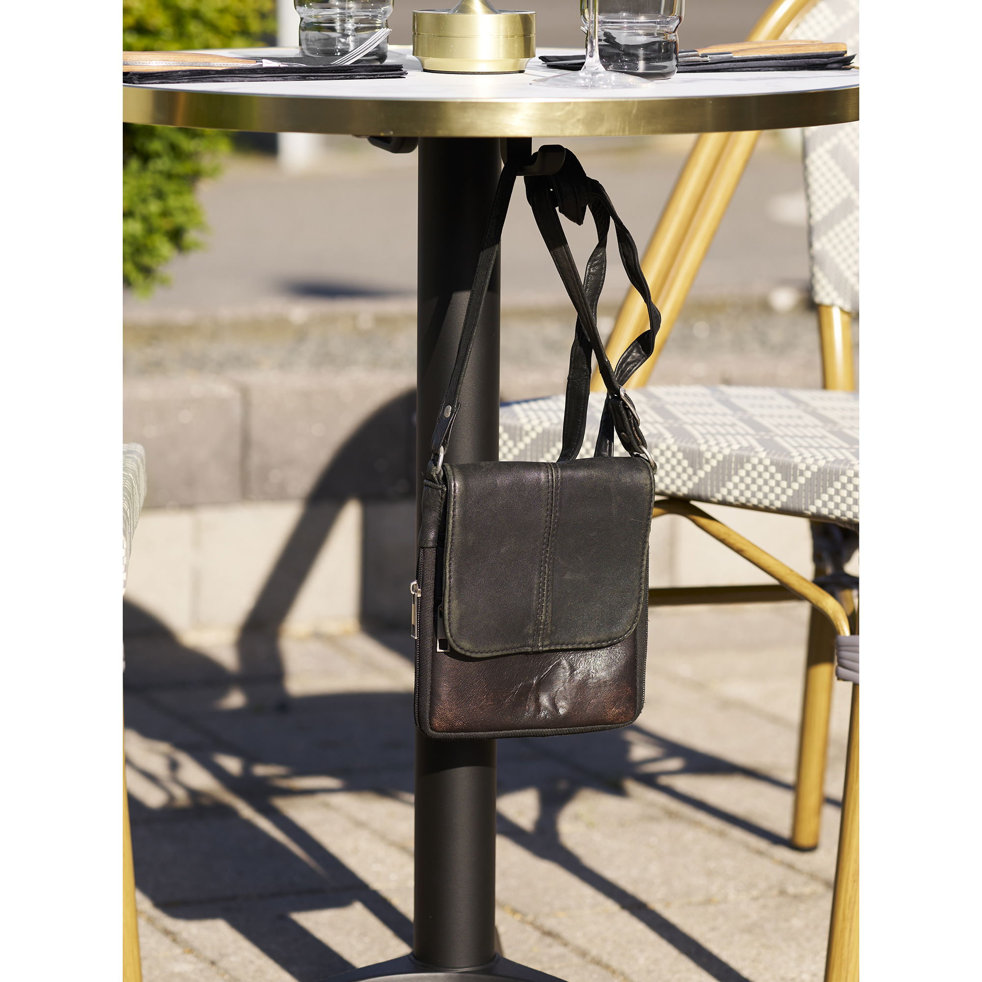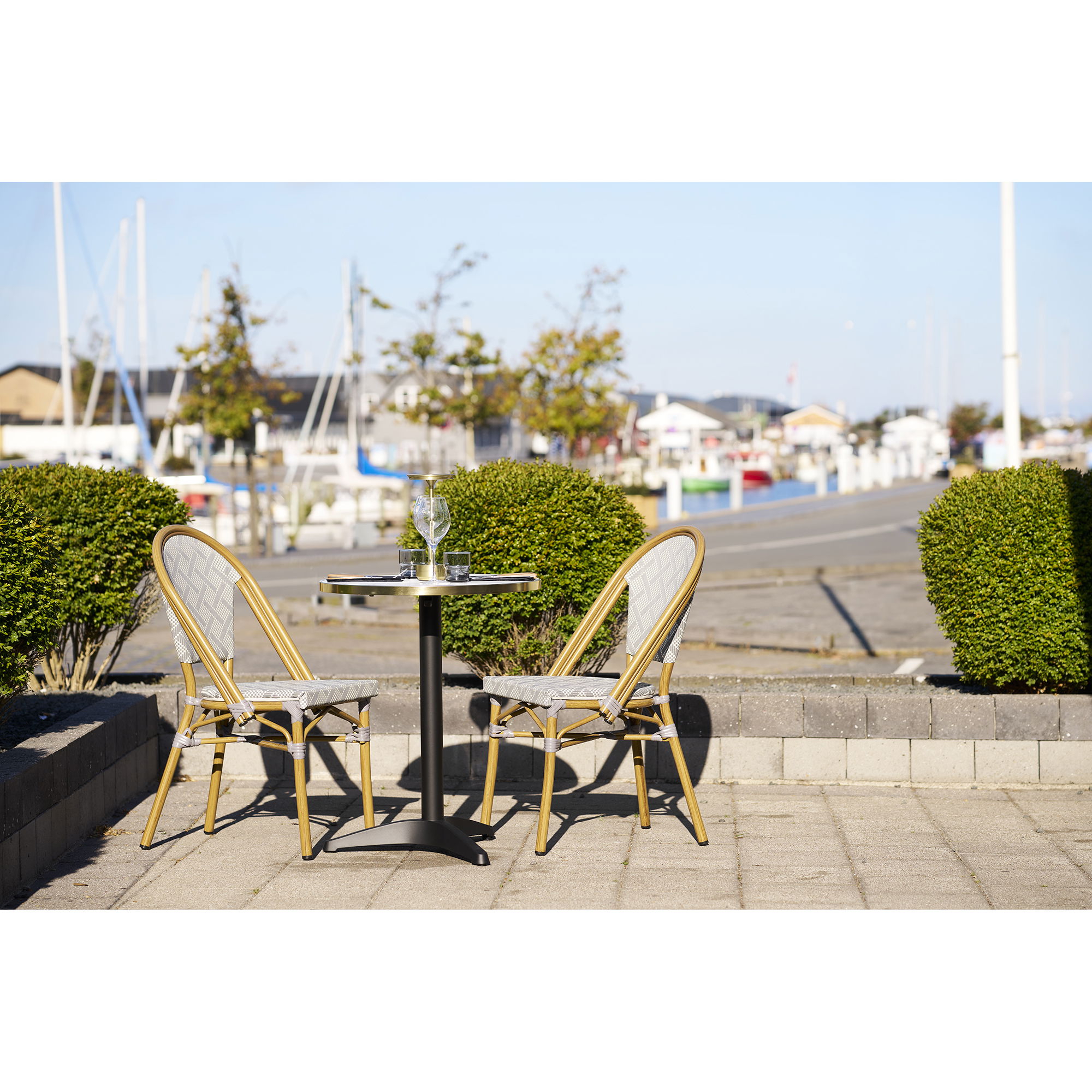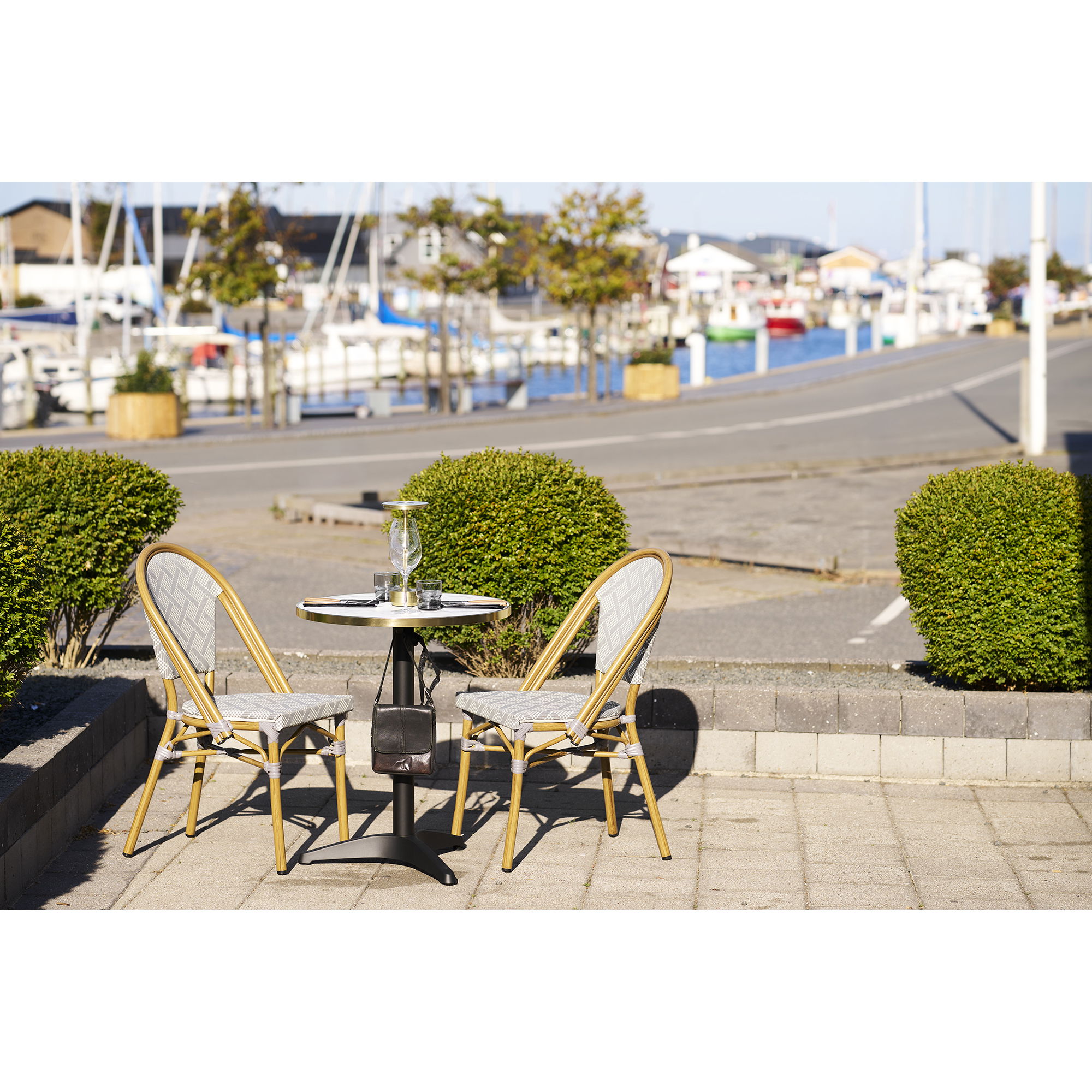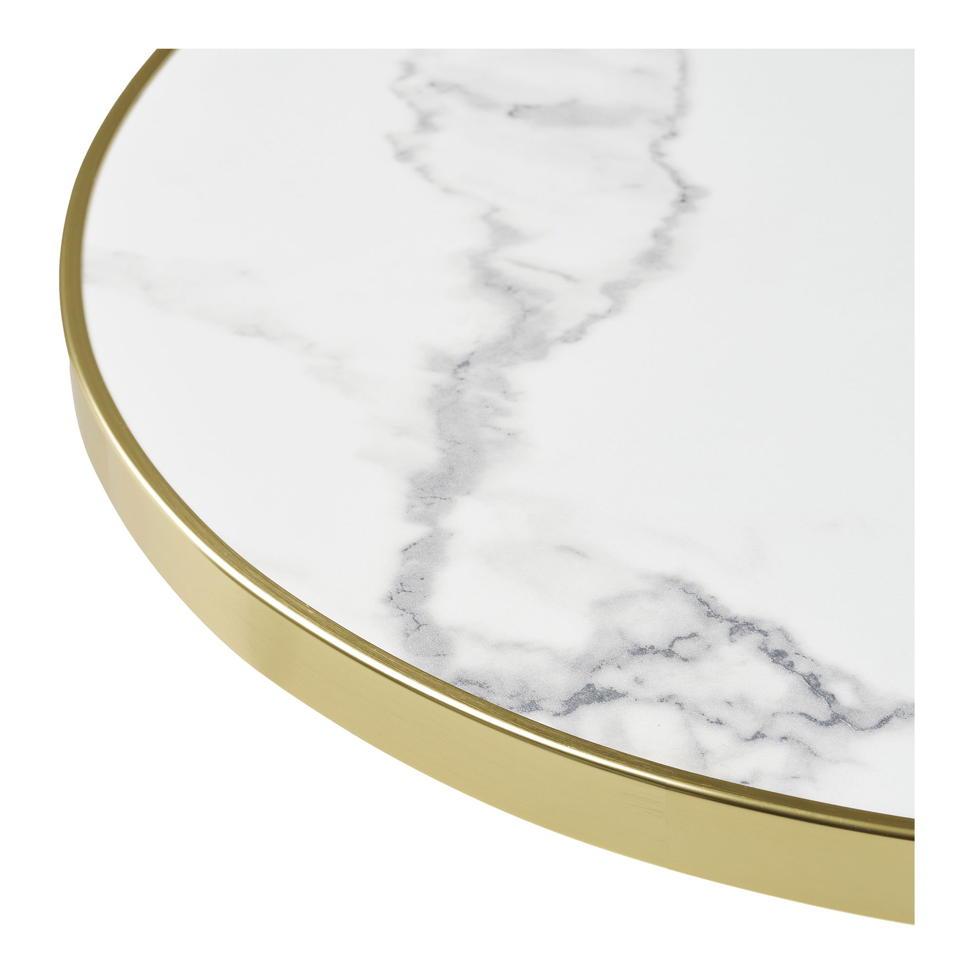 Moderan barski stol, idealno rješenje za kuhinje, barove ili terase, izrađen od izdržljivih materijala za dugotrajnu upotrebu, mramorni izgled, bijela sa zlatnim rubom, crne noge, aluminij, 60×73 cm